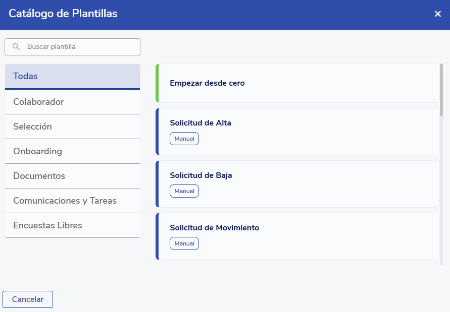 To do this, you can choose from a catalog of preconfigured templates or Start from scratch. For more details about each template type, you can review the articleWhat types of templates are available in Workflow?