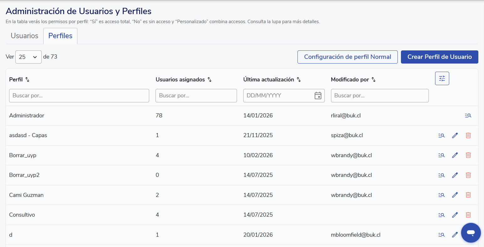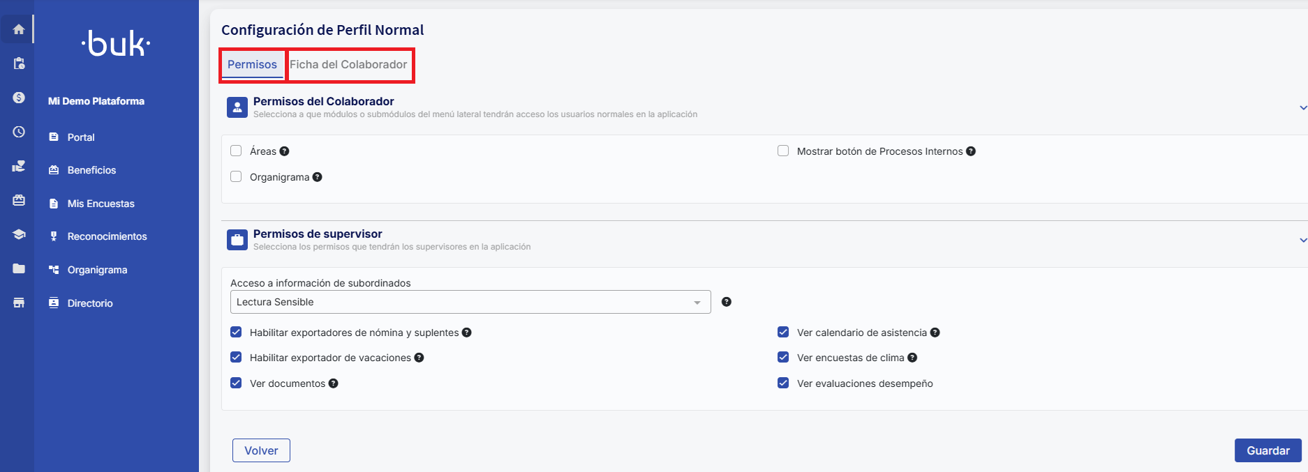 Thenormal profileis one of Buk's predefined profiles, intended for collaborators who access the platform with limited permissions. You can customize what information they can see on their personal profile and what actions they can perform, including additional permissions if they have people reporting to them.