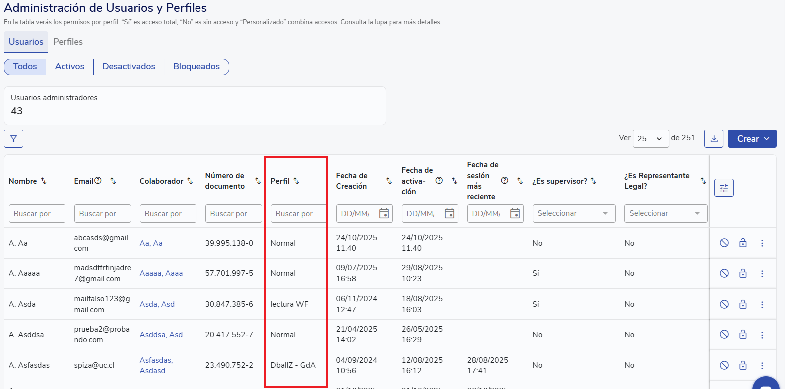 5. In the Users section, you can see which profile each user has: