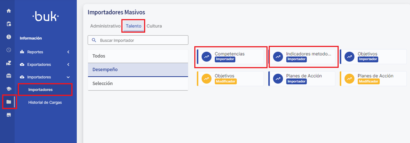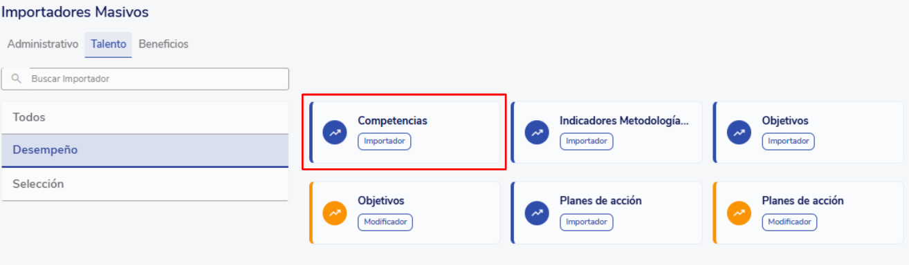 You can also upload competencies in bulk using importers. To do this, go to the "Información" section and select "Importadores." In the "Talento" tab, you will find the "Competencias" and "Indicadores metodología niveles de desarrollo" importers.