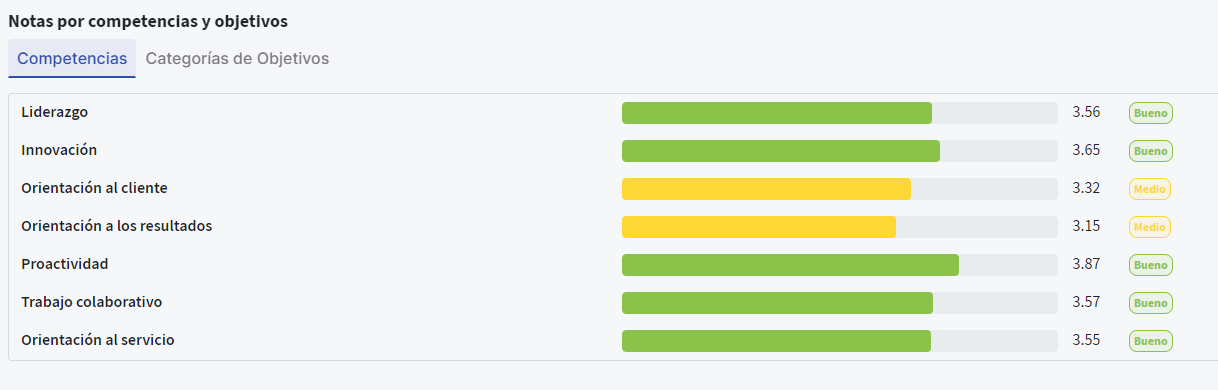 In the "Scores by Competencies and Objectives" section, you can review the general scores by Competencies in the "Competencies" tab, which is calculated as the simple average of the scores for each competency in the forms. Additionally, in the "Objectives Category" section, you will find the general scores of the objective categories, which are obtained by the arithmetic mean of all objective ratings within each category