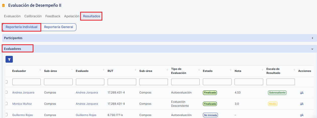 In the "Evaluators" tab you will find a list of forms by evaluation type. You can review in the columns information about the evaluator, the evaluator's subarea, the evaluated participant's document number, the evaluated participant's subarea, the evaluation type, the form status, the score for the evaluation type and the category in the results scale. In the "Actions" column you can view the form with the responses for each evaluation type. Use the filters of each column to search for specific evaluations. You can also add additional conditions to the filters to display the information you need.