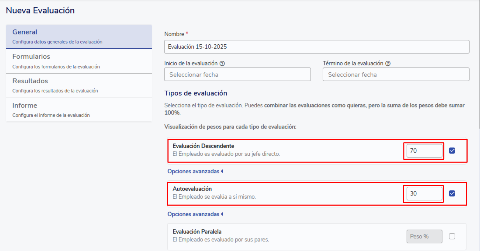 In our example, the evaluation was configured only with downward evaluation and self-evaluation, assigning them weights of 70% and 30%, respectively.