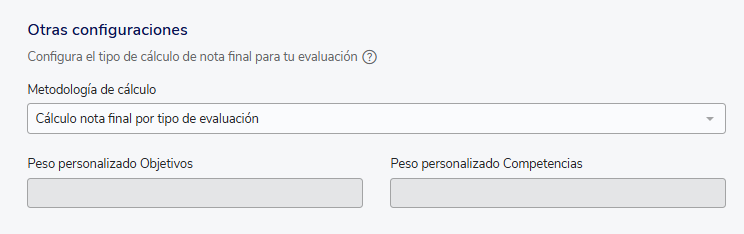 When you configure a performance evaluation, in the tabResultsyou have the flexibility to select the methodology that will determine how the employee's final score will be calculated. By default the selected option isFinal score calculation by evaluation type.