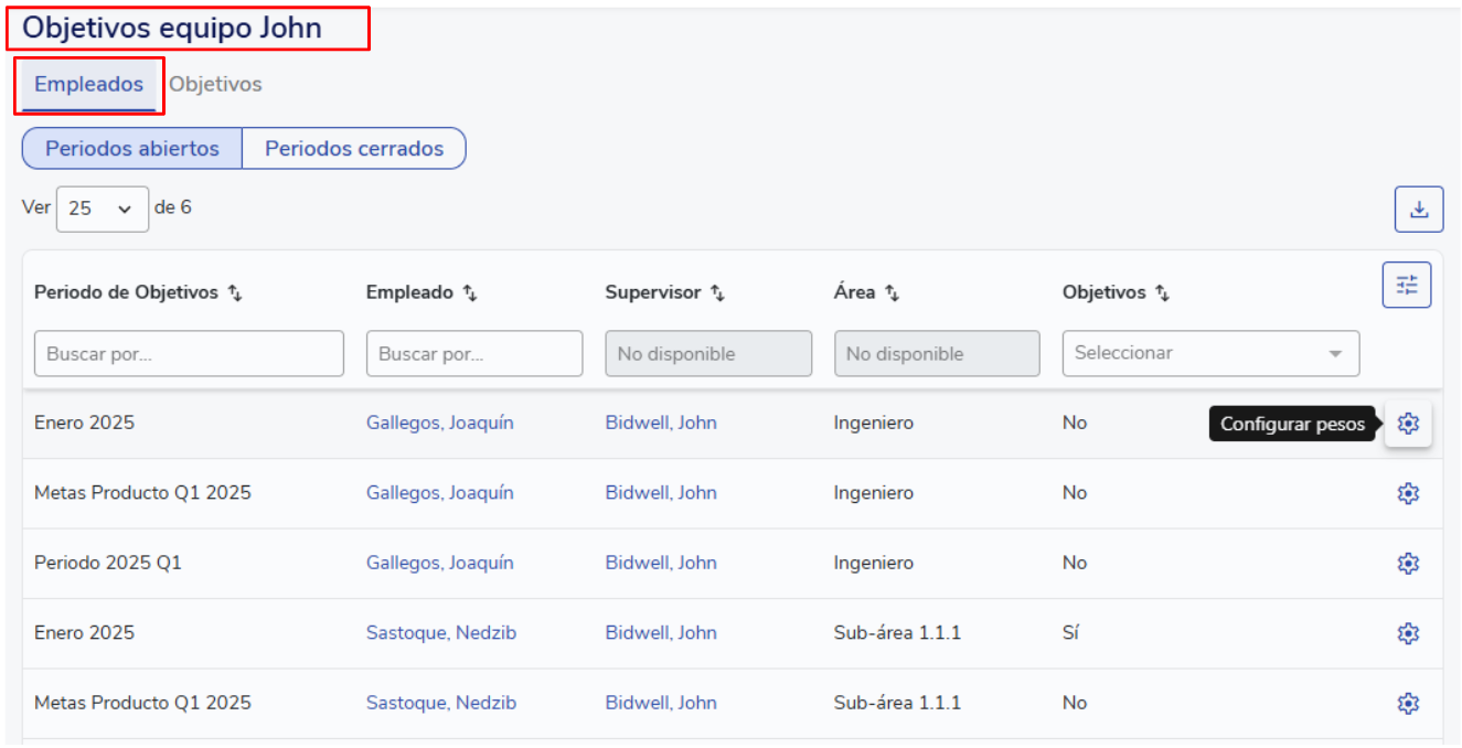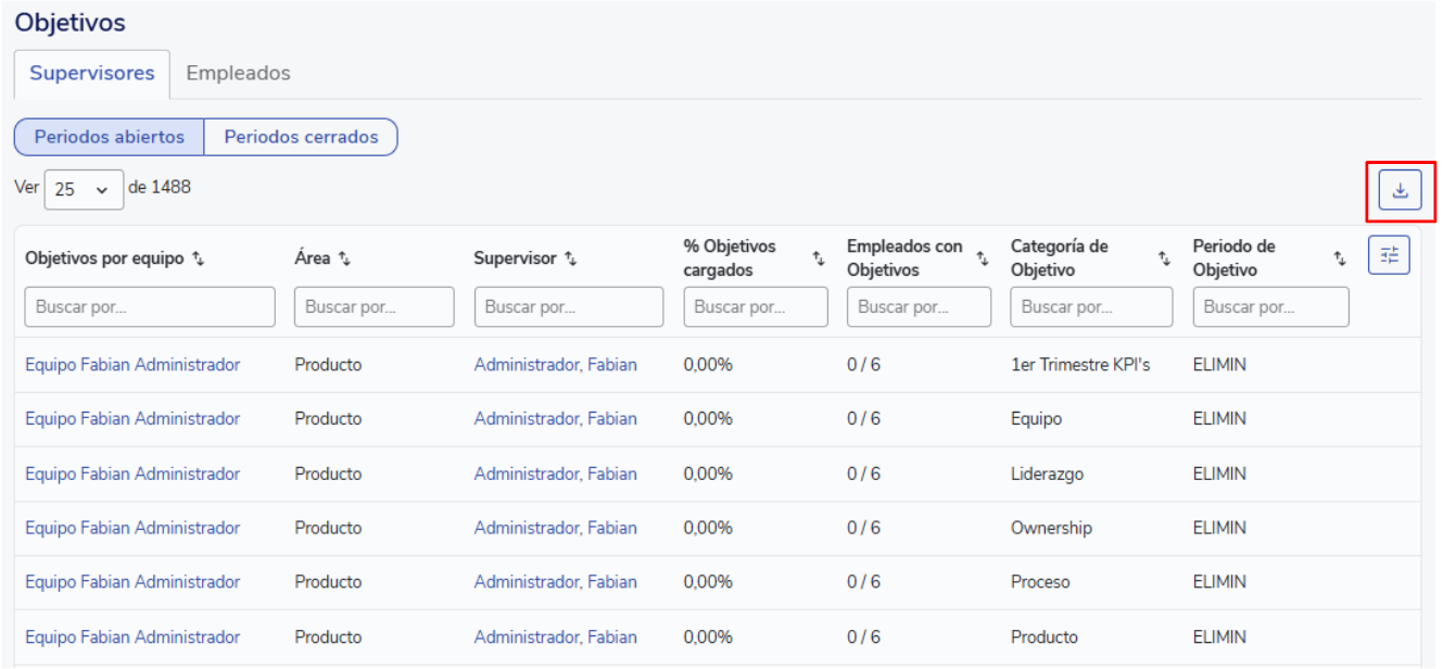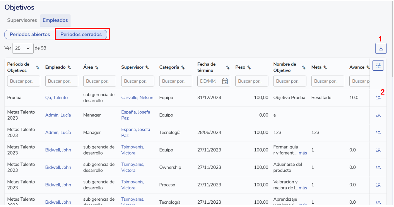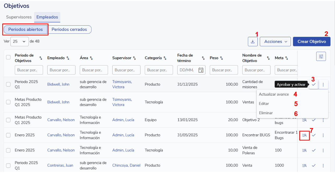 In this tab all the objectives registered on the platform for each employee are shown, along with the detailed information of each, for a set of periods.