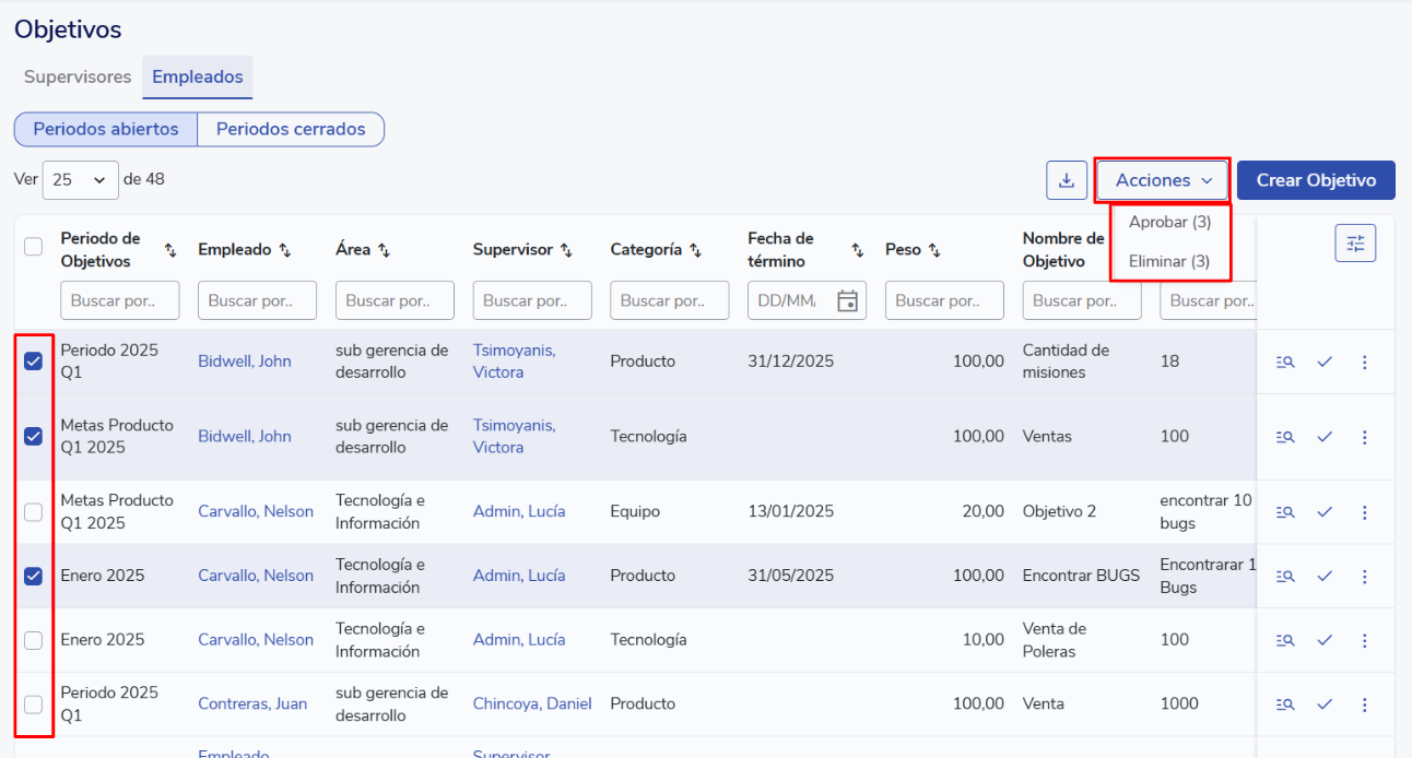 - In the tab“Open Periods”you can perform actions such as:view details, approve, update progress, editanddelete. You can also create new objectives. The approve and delete actions can also be performed in bulk from the "Actions" button by selecting the objectives you require.