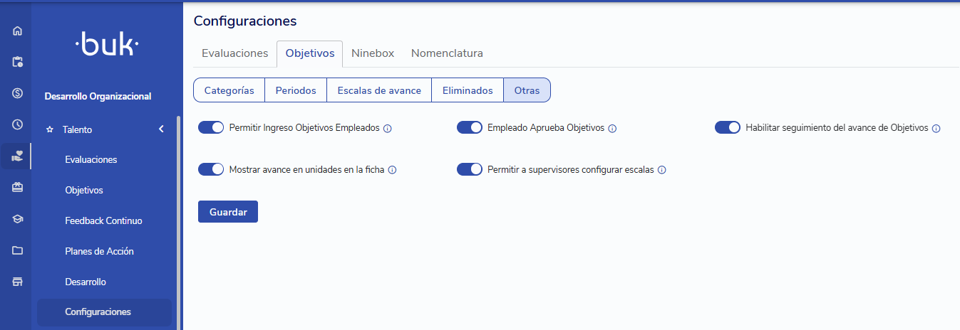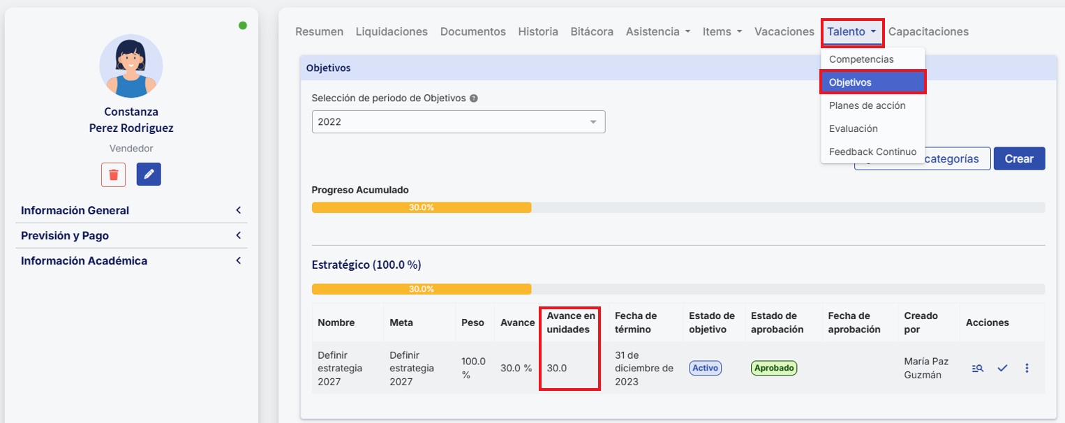In the Performance Management module, you have the option to register employees' goals. Both leaders and employees can track these directly from each employee's profile. In addition, you can include these goals and measure them in performance evaluations.