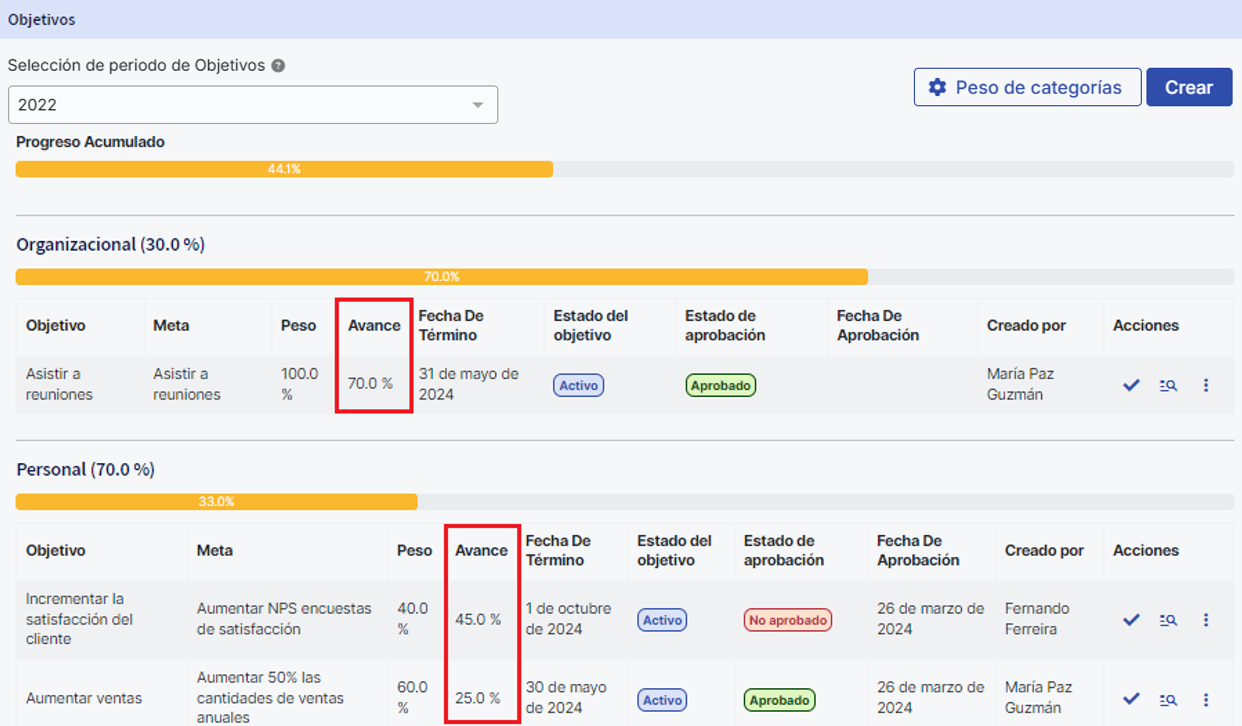 This functionality enables tracking of goals by allowing employees and leaders to periodically enter the percentage of progress directly on their profile. By recording progress on goals, progress by category and cumulative progress can be automatically reviewed, providing a clear and up-to-date view of progress.