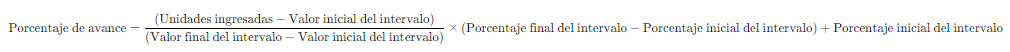 For example, to calculate the progress percentage for1700 units, this value falls within thesecond interval. Therefore, the calculation considers that 100% corresponds to 1500 units (initial value of the interval) and 120% to 2000 units (final value of the interval). The formula to calculate the progress percentage in this second interval is: