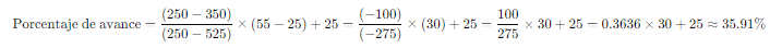 It is also possible to set intermediate points on the scales. For example, this scale was created with intermediate points. In this example, the progress percentage is calculated for an entry of 350 units, using a scale with intermediate points. The initial value of the interval is 250 units, corresponding to 25% progress, and the final value of the interval is 525 units, which is equivalent to 55% progress. The linear interpolation formula is applied as follows: