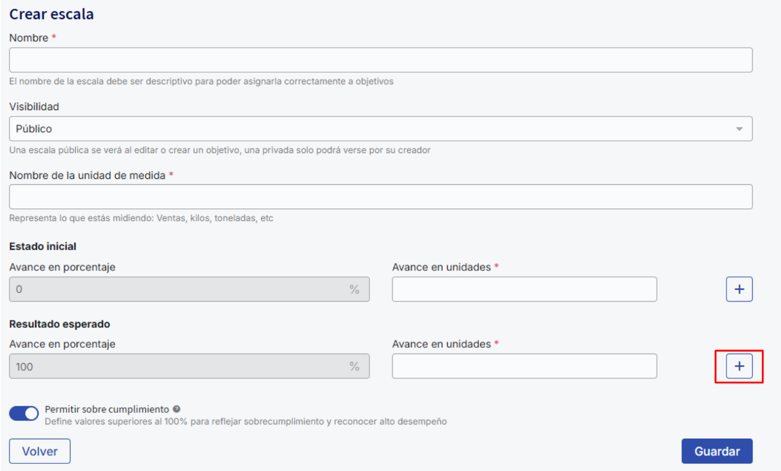 When you activate the overachievement switch, the option to add values for scales above 100% will be enabled.