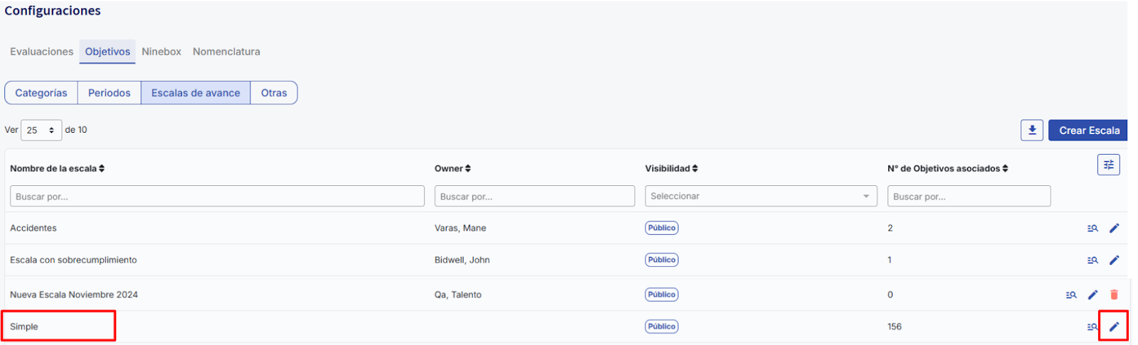 Next, select "Goals" and click on "Progress Scales." There you will find the created scales; by default, already created goals will be selected with the “Simple” scale, maintaining their current behavior. To create new scales, click on "Create Scale."