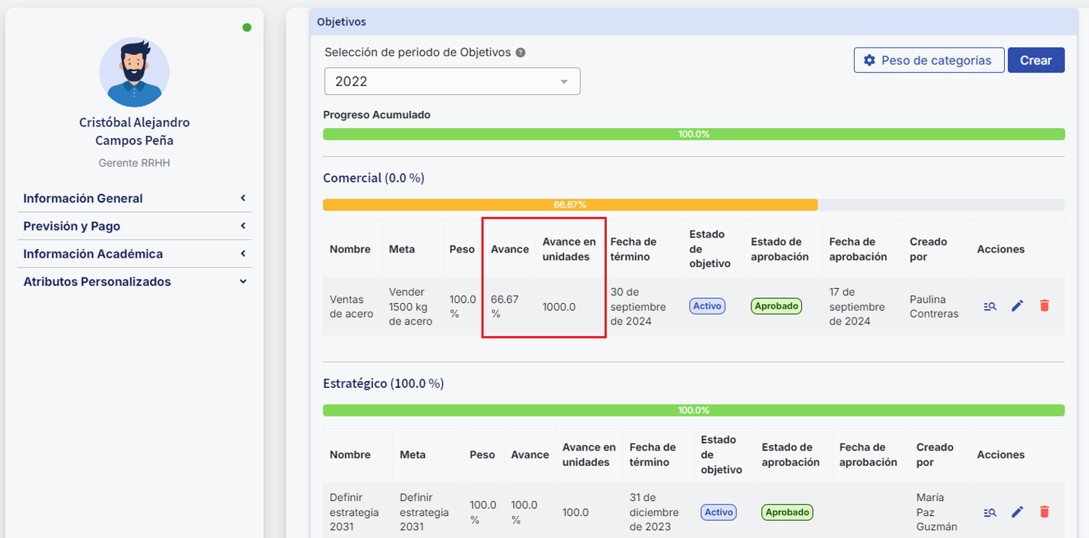 - Progress percentage:This is the percentage progress automatically calculated by the system according to the scale used, based on the units entered and the points defined in the scale.