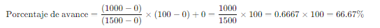 If a scale is set where 0% progress corresponds to 0 units and 100% progress corresponds to 1500 units (with no intermediate points), the calculation of the progress percentage for an entry of 1000 units is performed as follows: