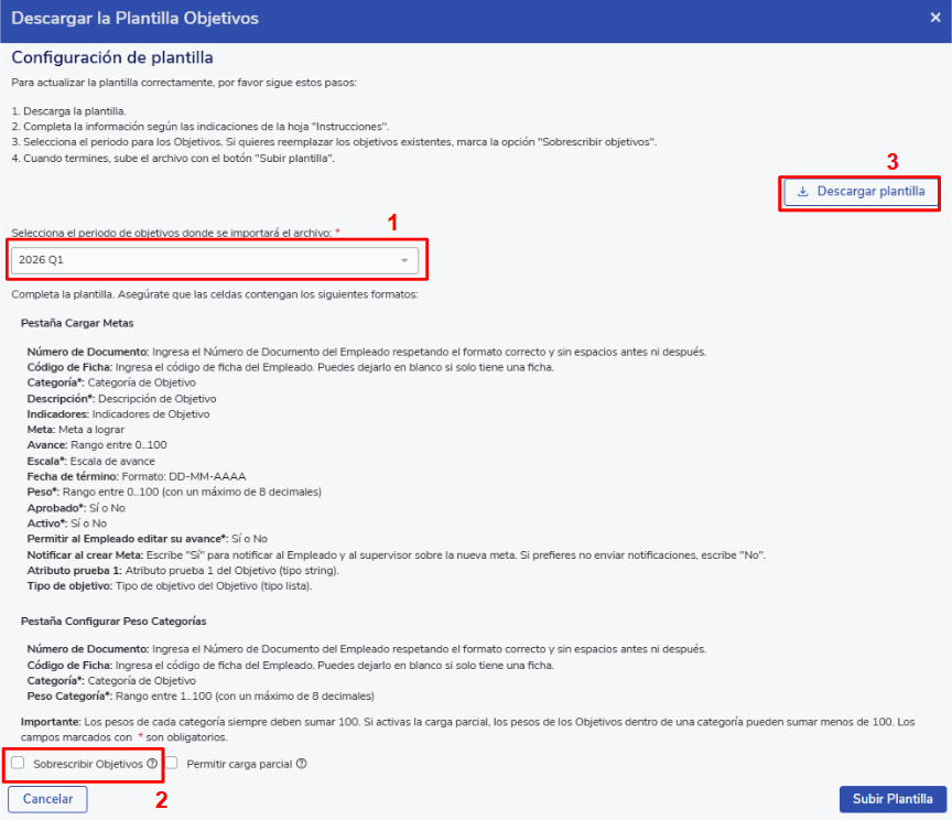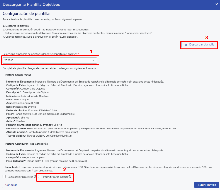 - Partial upload:This mode allows you to add objectives on a case-by-case basis, without needing to upload the total objectives for the period. When using this option,it will not be validated that the sum of the weights completes 100%; however, it will be validated that the sum of the weights does not exceed 100%.