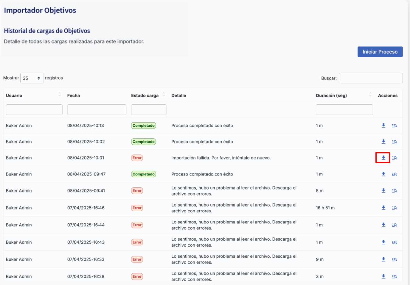 To review errors, simply click the download button corresponding to the upload you want to examine. This will download a new version of the file in which rows with errors will be marked in red. In each of these rows, the last column will indicate the reason for the error, although only the first error detected per row will be shown.