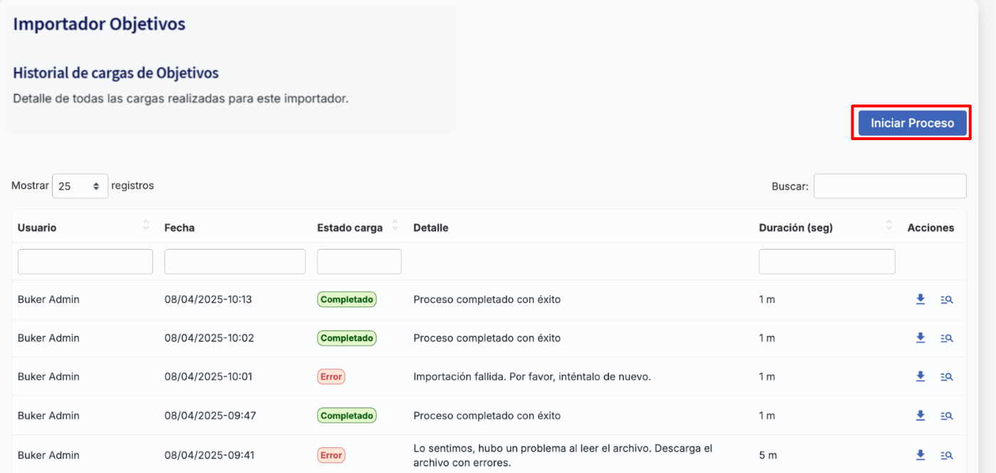 After uploading the file, you will return to the upload history, where you can check the status of each upload, whether successful or with errors. It is important to keep in mind that an "error" status does not necessarily mean the entire document is incorrect; it may be due to one or more rows with specific issues.