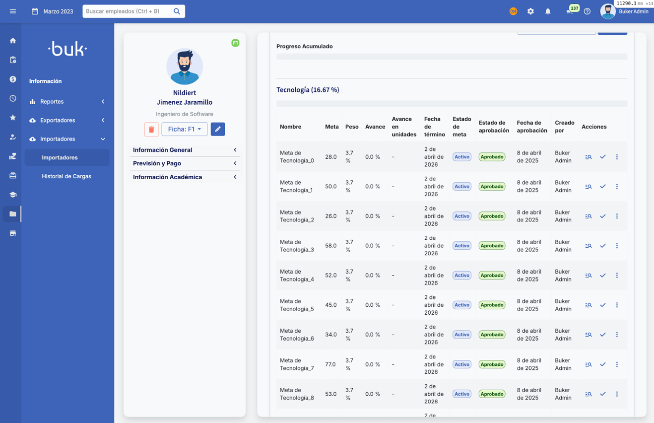 You can import objectives in bulk using Excel templates. To access this option, go to the"Information"module, select the"Importers"section and then again select"Importers". Within the available categories, choose"Talent"and then"Objectives (Importer)".