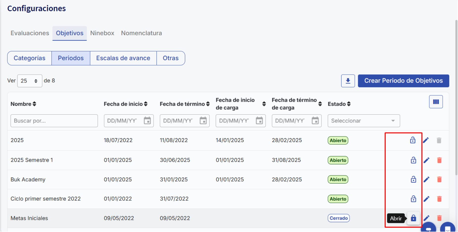 When creating this new objective period it will always appear closed; to activate it you must do so manually with the padlock symbol mentioned above.