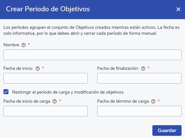 In the same view, you can create a new period with the "Create Objective Period" button; this opens a window where you are asked to enter the following data: