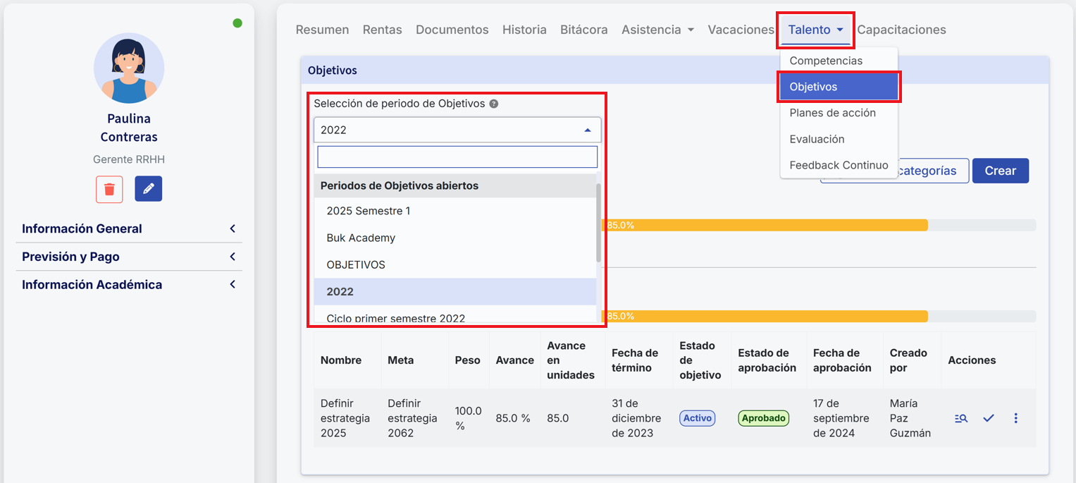 If more than one objective period is open, when entering the "Objectives" module a selector will be displayed to choose the period to view. Likewise, when accessing an employee's profile, in the "Talent" tab and selecting "Objectives", you must also choose the period to view.