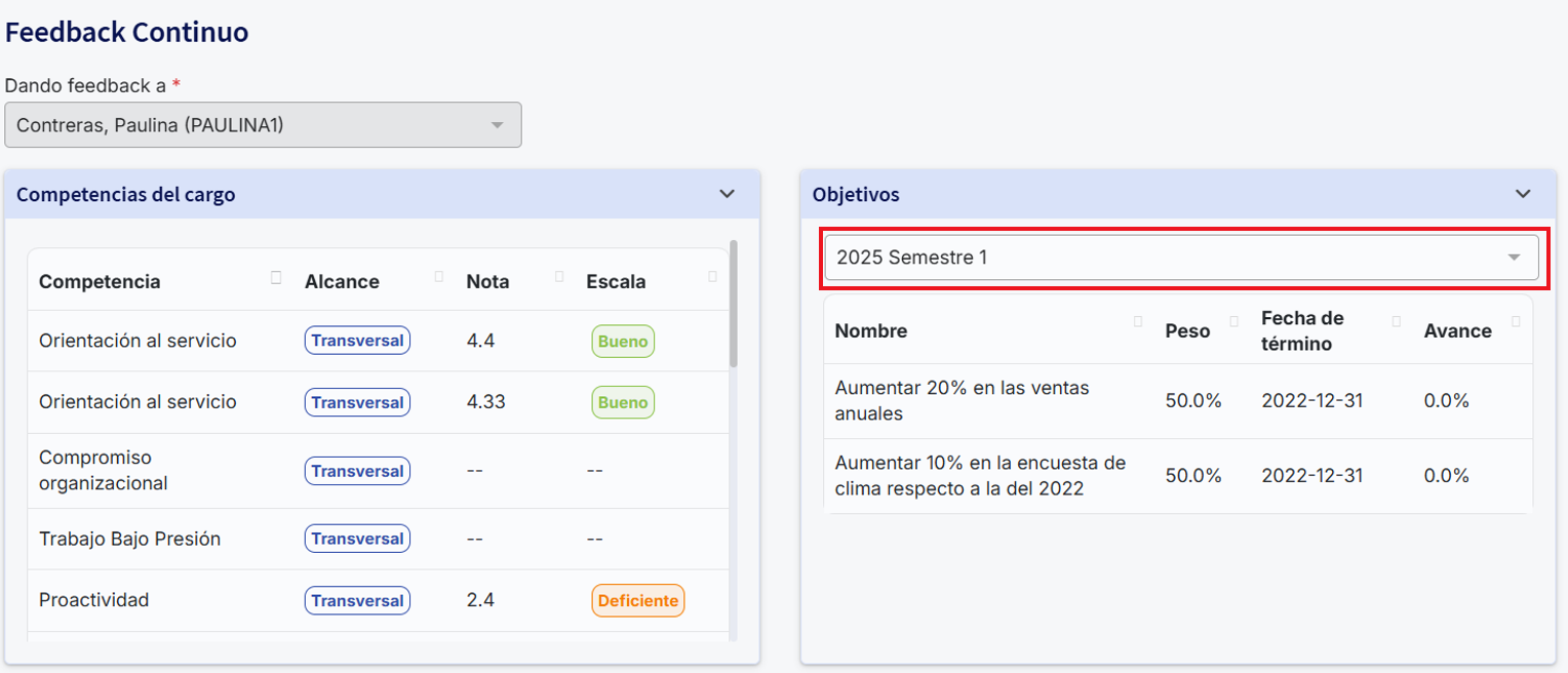 On this page, both the job competencies and the objectives are managed. For the latter, the supervisor must select the period for which they want to perform the feedback. At the bottom of the page there is a space to record written feedback on the mentioned parameters.