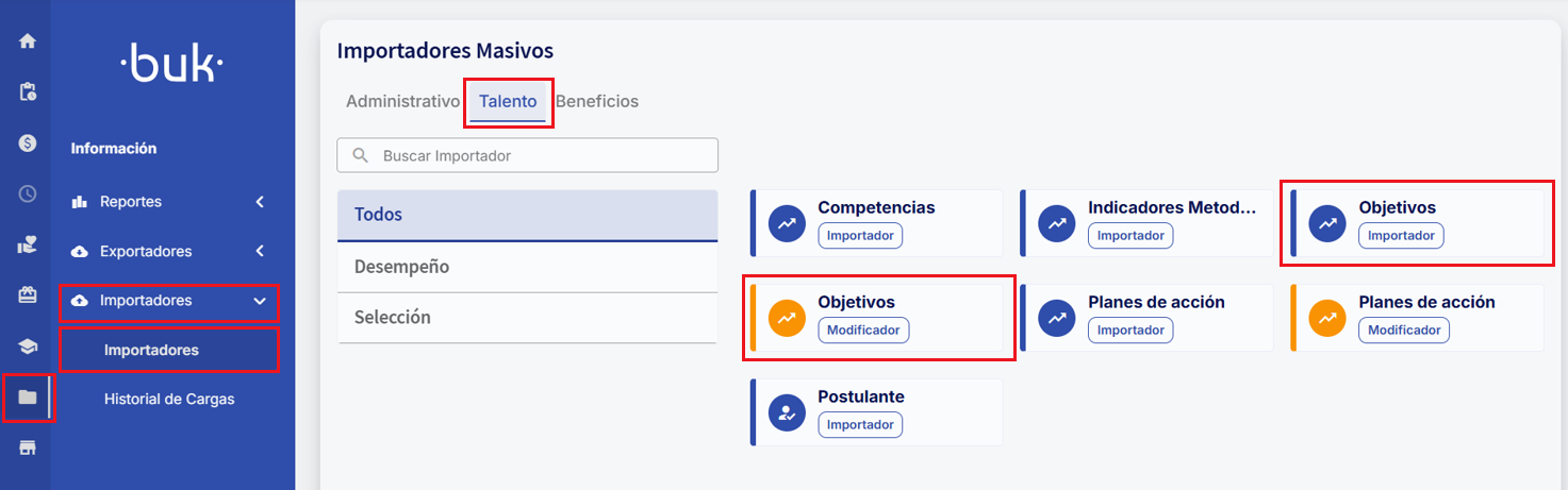 To perform bulk uploads or modifications of objectives, you must go to the "Information" section within the "Importers" module and click "Importers".