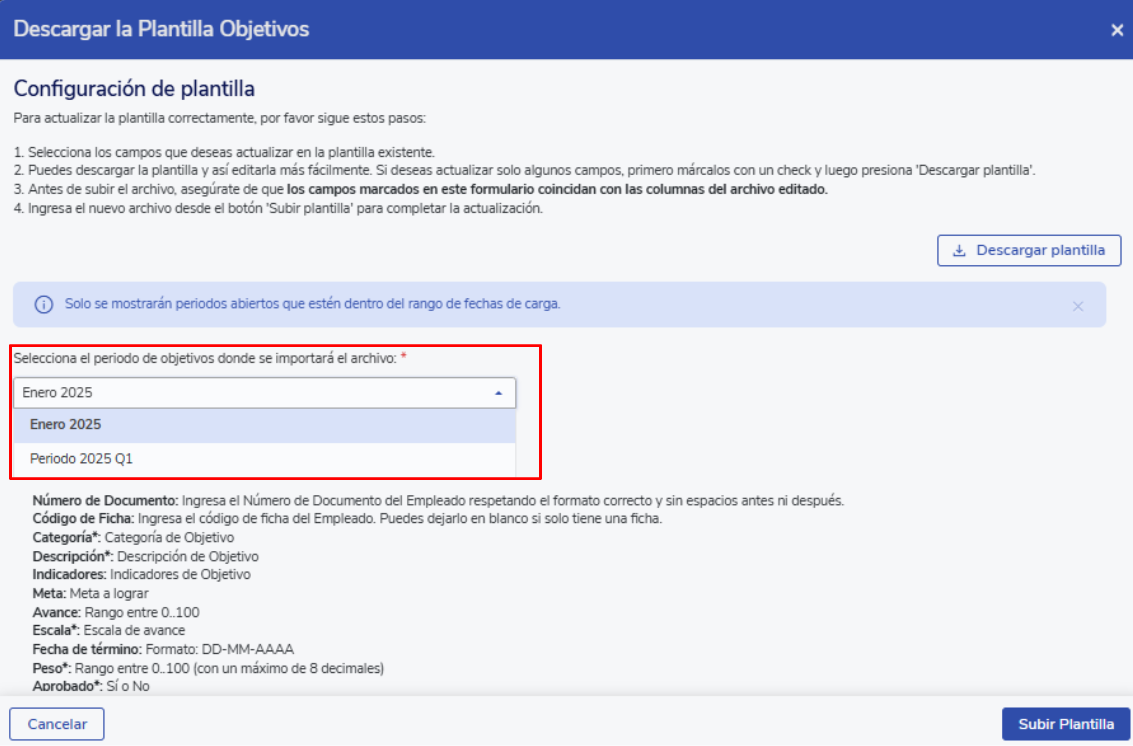 In this section, select the objective period that will be evaluated, allowing only one period to be evaluated at a time. However, it is possible to upload objectives into a different period than the one under evaluation.