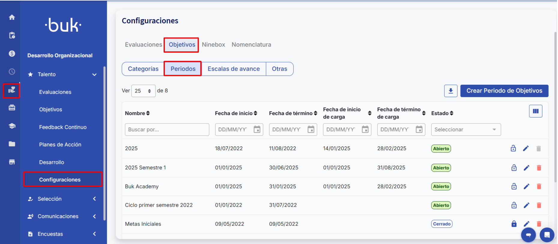In the "Talent" module, objectives are managed through defined periods, allowing the creation and modification of goals within specific time spans. It is possible to manage multiple active periods simultaneously and perform performance evaluations for a specific objective period while others remain active.