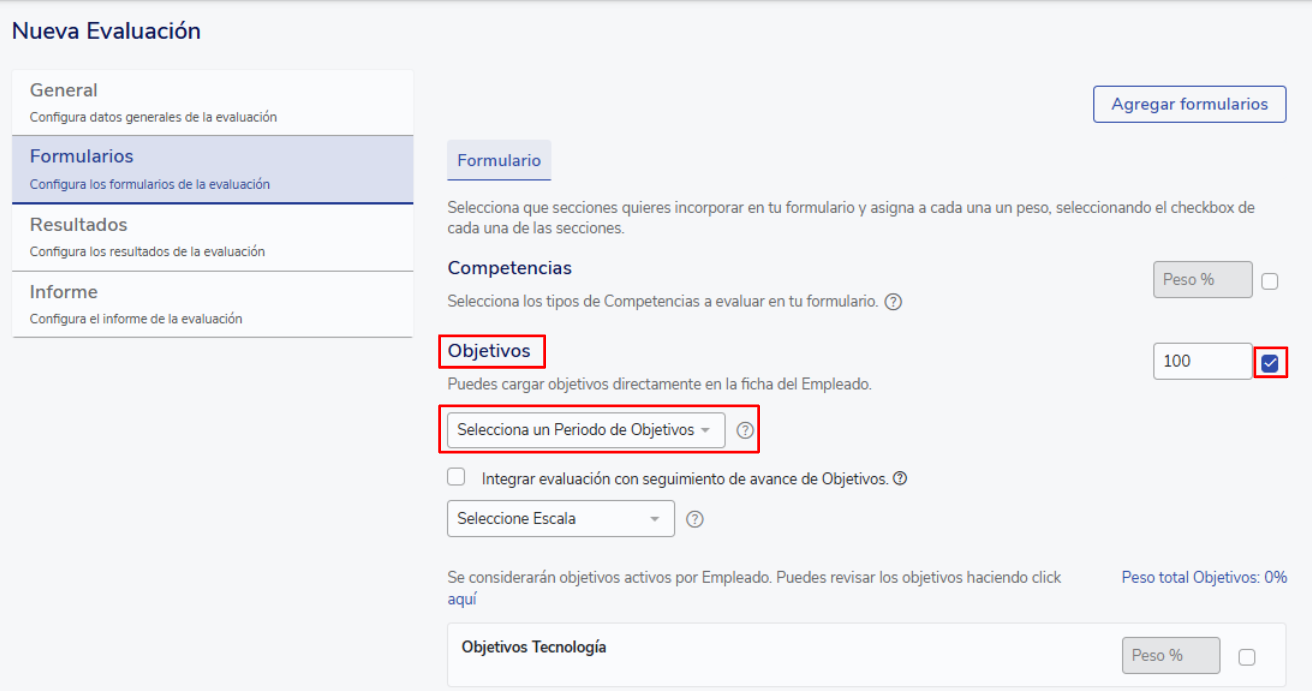 After defining the "General" section, when accessing the "Form" section you can add objectives. It is important to remember that to include them you must check the box located on the right side.