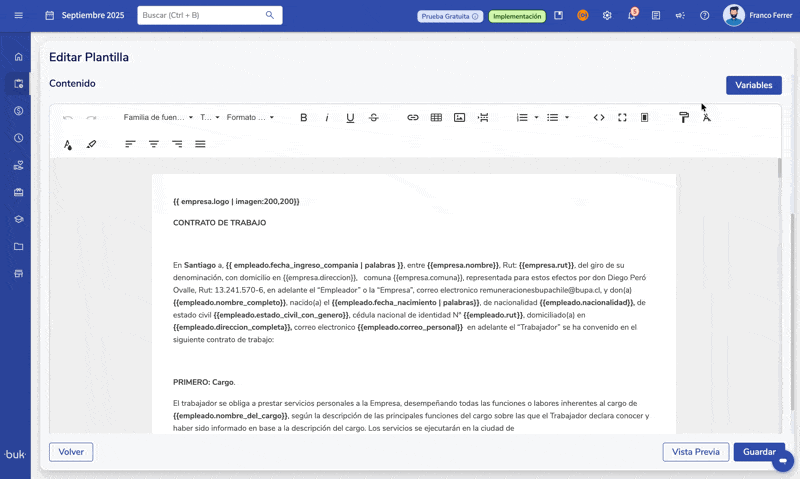 From the home page of your Buk platform, go to the main menu located on the left side of the screen. Within the"Administrativo"menu and in the"Documentos y Firma"module, under the"Plantillas"tab, select the template you want to edit or create a new one to access the editor.