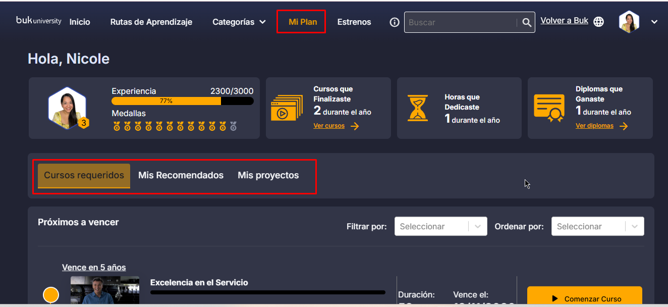 - : shows the courses you have already started. You can see your progress through a progress bar.Required