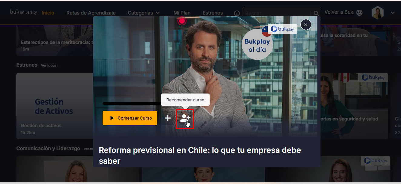 Click on the course to access the modal view.Look for the person icon 👤.When you click it, a list of team members you can recommend the course to will appear.