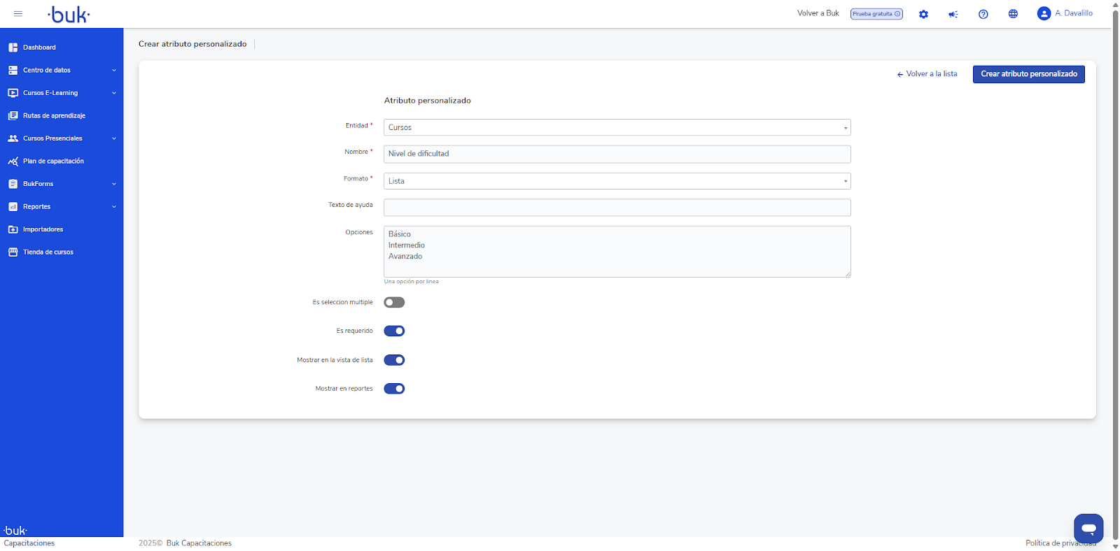 Attributes created in Buk and associated with the Collaborator entity will now also be visible in the LMS (Buk Capacitaciones).