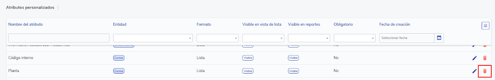 Step-by-step instructions on how to create, configure, and manage custom attributes in the LMS, considering the different available format types and management rules according to the associated entity.
