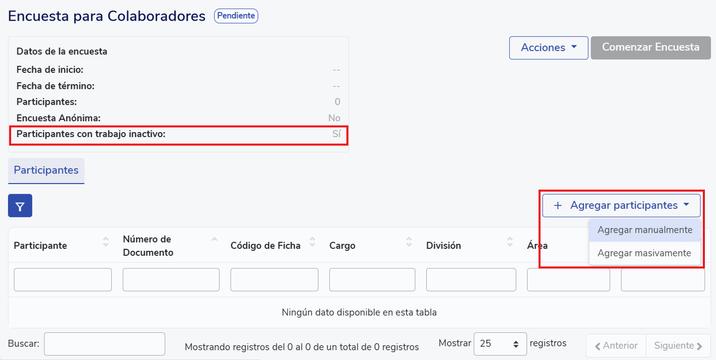 In the new view, you can verify that the survey is enabled for people with inactive employment thanks to a message visible in the upper-left box. From this screen you can add participants, both manually and in bulk. It is important to note that you can only add employees who currently have an inactive record.