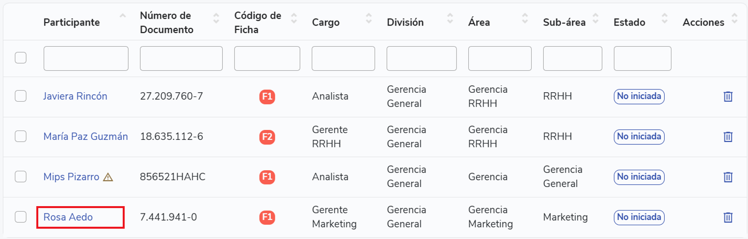 When returning to the previous view, the list of participants will appear in a table where the record code for each will be visible. It will also indicate if any of the employees does not have a personal email registered, with a warning symbol. In that case, the survey will be sent to the work email. If you want to add or modify the personal email, this change is made directly in the employee's record (instructions on how to do so are explained below).