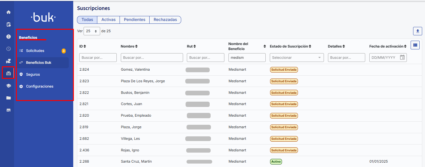 To determine the specific status of an employee with respect to a Buk additional benefit, review the subscriptions in the section located in the left sidebar "Beneficios" and only those with modification permissions for the Beneficios module can access it.