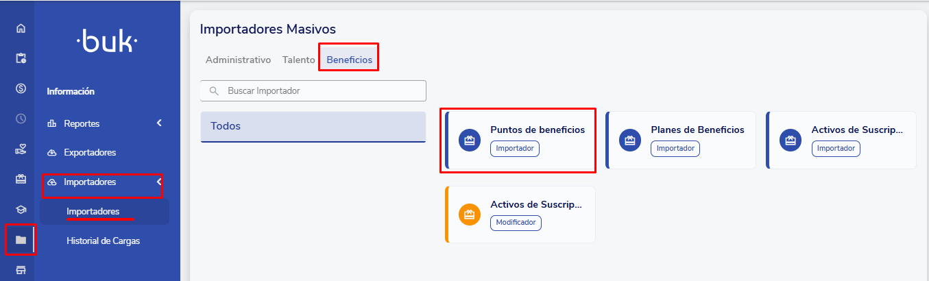 - Go toInformación > Importadores > Beneficios > Puntos de beneficios.