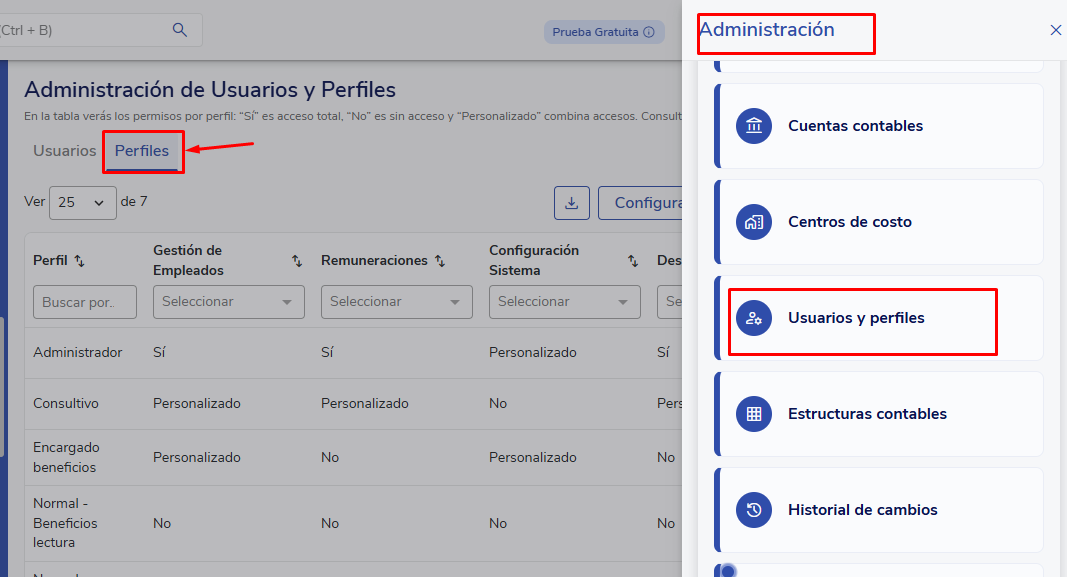 From Administración>> Usuarios y Perfiles >> Perfiles>>Crear perfil de Usuario, you can create your personalized user profile