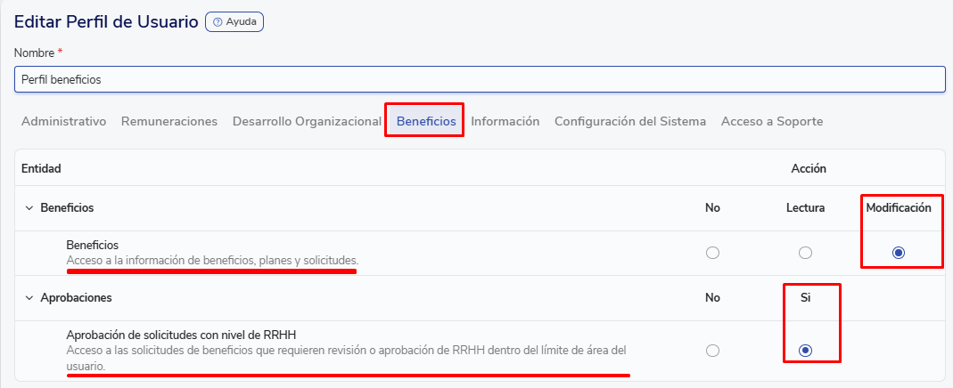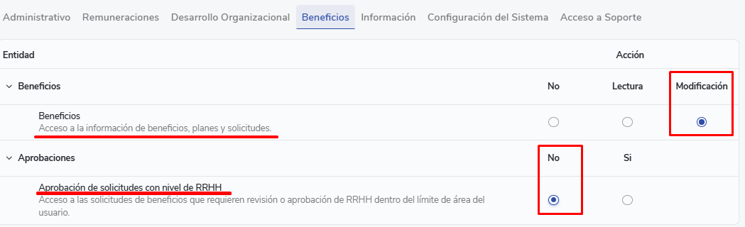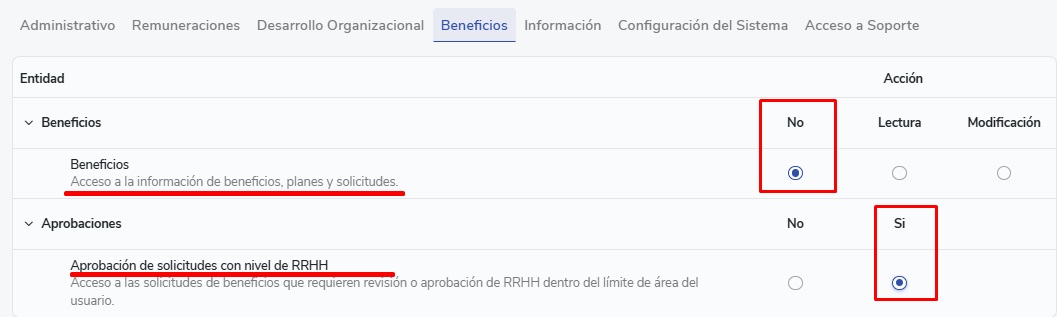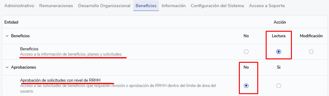 - Approvals:You will have access to approve all requests with approval level RRHH. You can do so even if you have an area limit, but only for requests within that limit. This permission is intended for users who need to participate in request approvals without necessarily having access to modify benefits, configurations or plans.