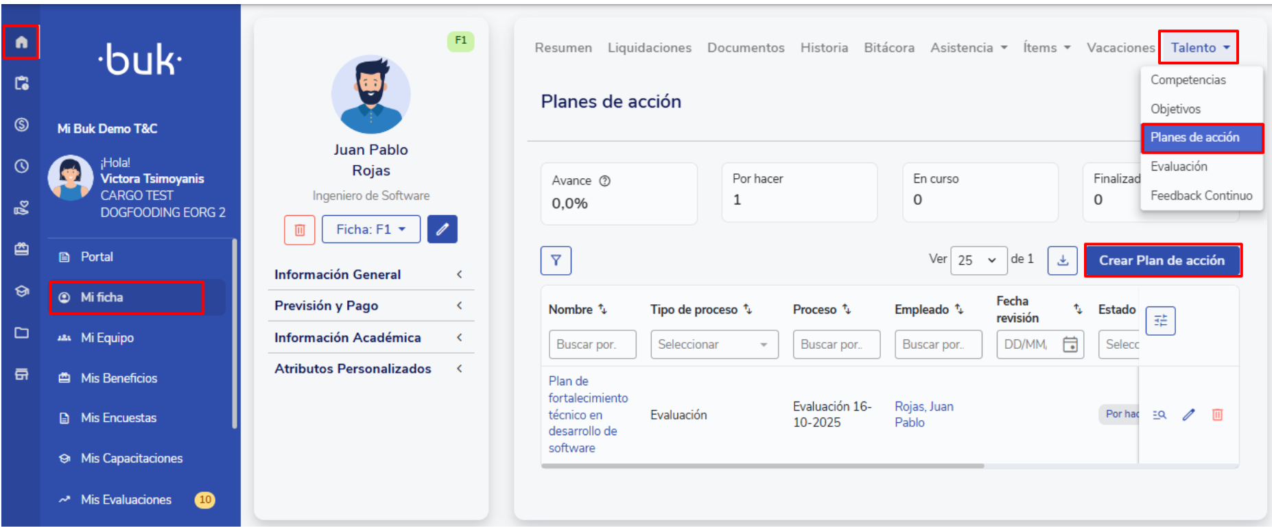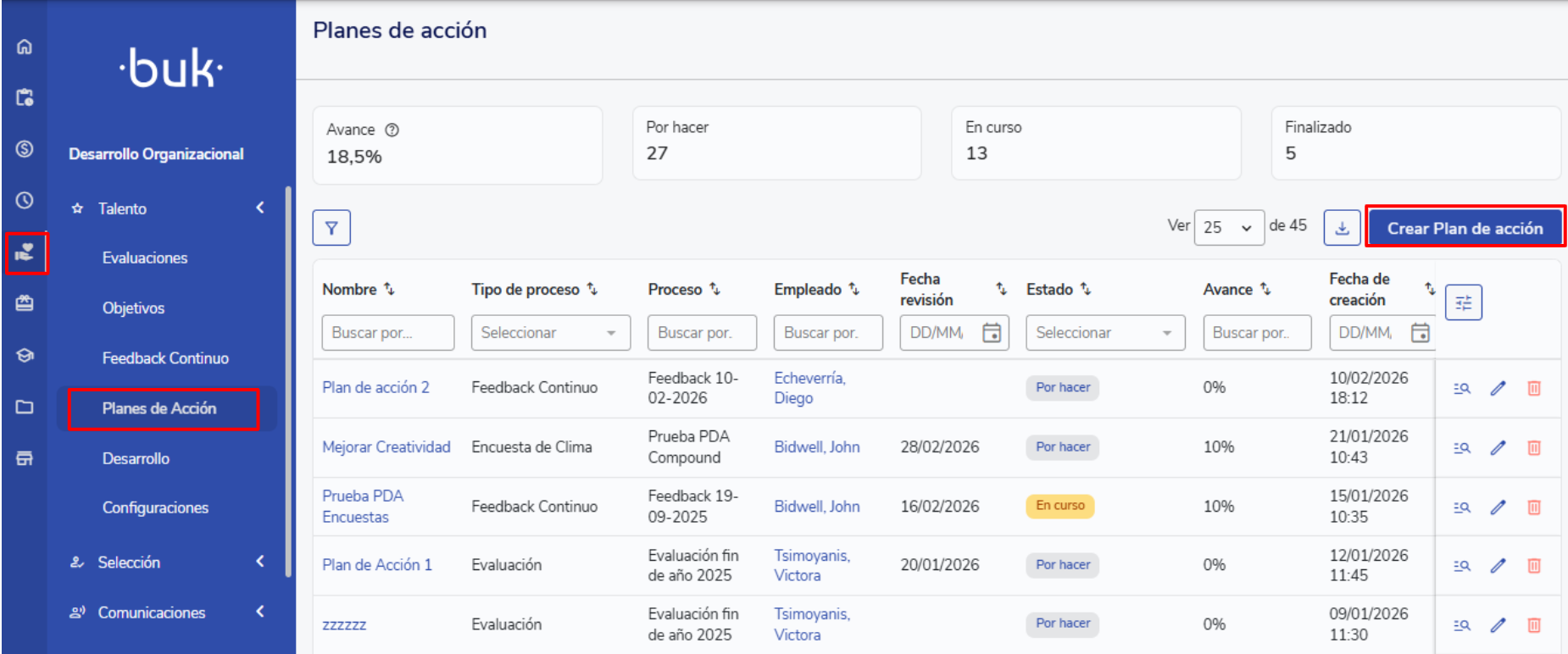 You can create action plans associated with Evaluations, Continuous Feedback, or Climate Surveys from each process's module, the employee's profile, or the general Action Plans module.