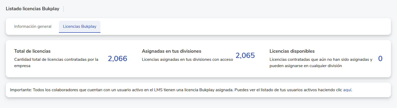 Total licenses:Shows the total number of active users in your LMS. Since Bukplay's model is total licensing, each active user counts as one license.