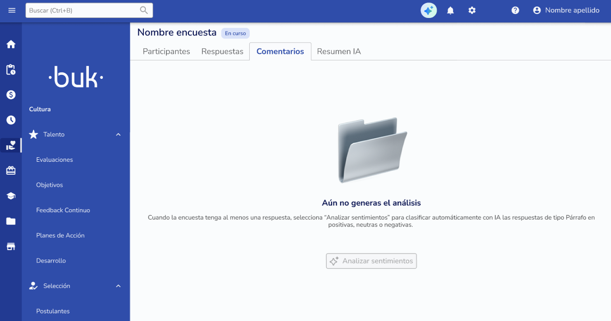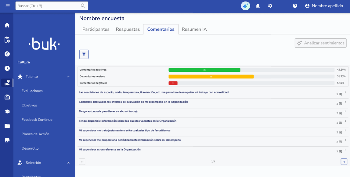 Now you can enhance the analysis of yourOpen Surveysusing Artificial Intelligence. This feature allows you to automatically interpret your collaborators' open-ended responses, classifying them according to the tone of their message. This way, you can quickly identify whether comments arepositive, neutral, or negative, saving valuable time in managing workplace climate and culture.