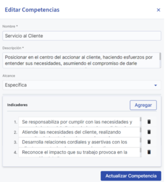 This way, you can evaluate the same competency across all roles while adjusting the required level according to the role's experience or responsibility. This allows the same competency to have different indicators depending on the assigned development level.