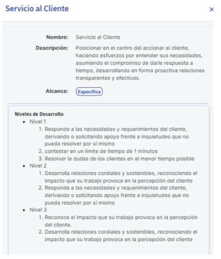 By contrast, this methodology allows you to define different development levels for the same competency, according to experience or responsibility levels within the organization.