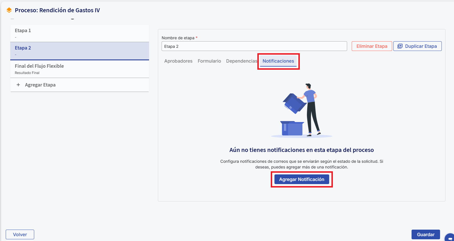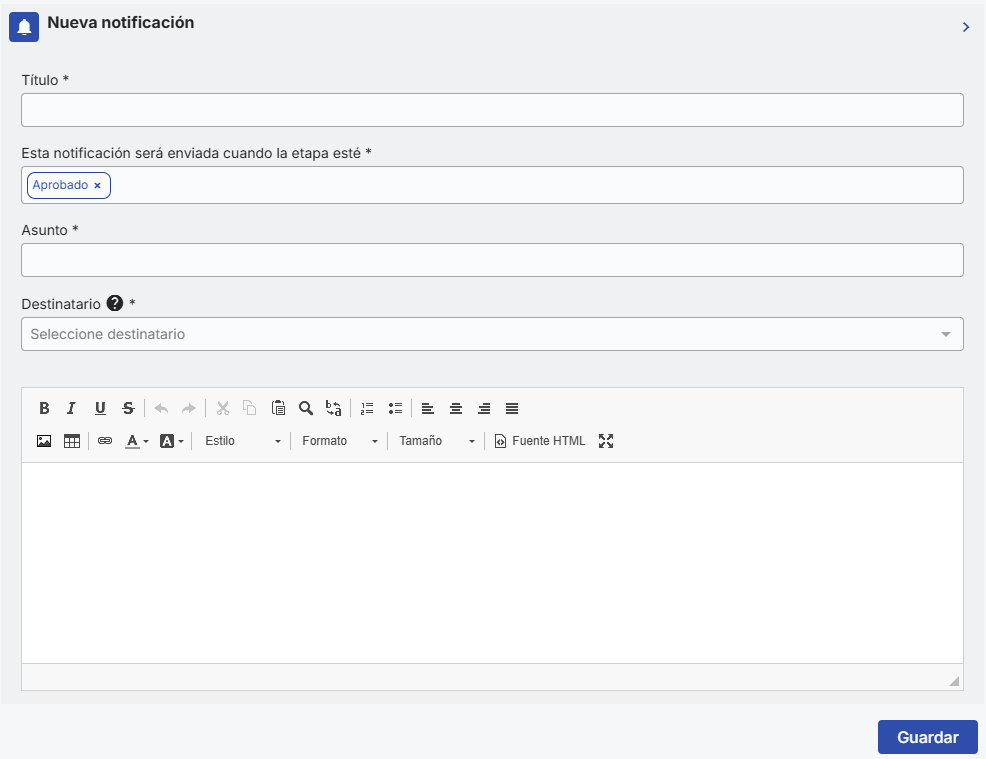 Destinatario: puedes elegir entre Dirección de email, Encargado de etapa, solicitante del proceso y Aprobador de la etapa anterior.