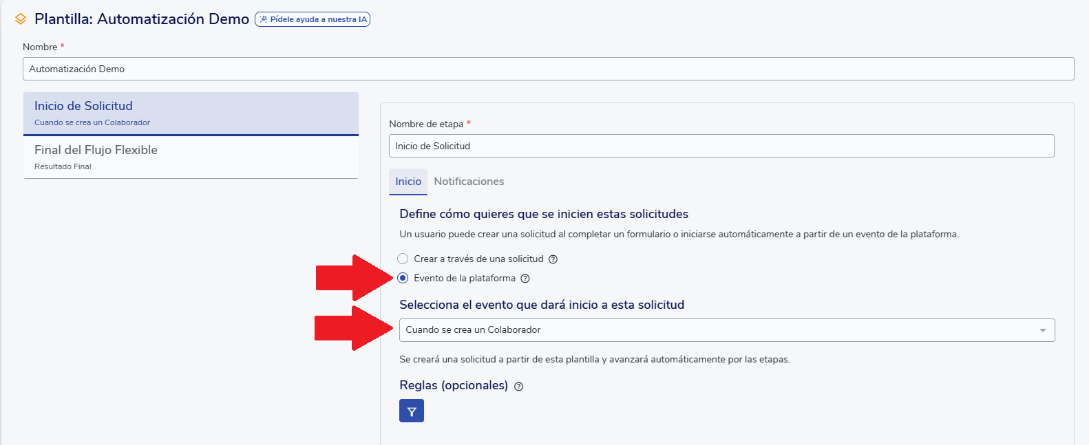 3. En la configuración de la plantilla, selecciona inicio por "Evento de la plataforma" y elige el evento que dará inicio a esta solicitud