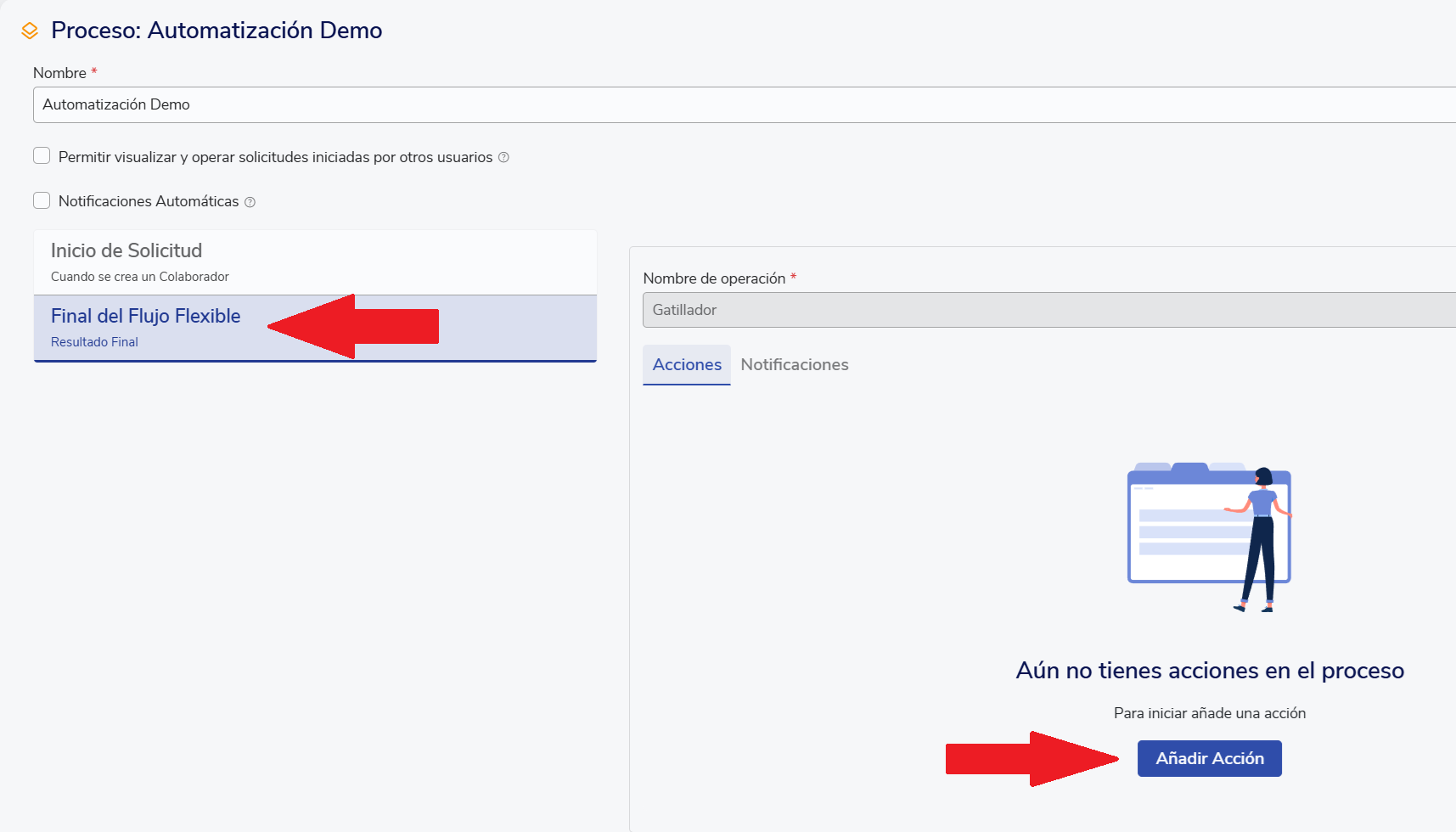 En la etapa final del flujo, podrás definir la acción que se ejecutará automáticamente cuando ocurra el evento: