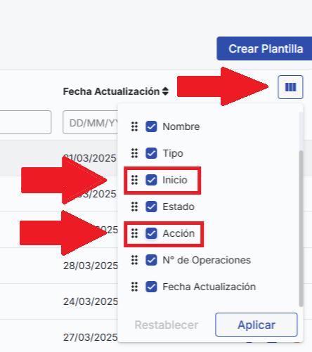 Puedes ver todas tus plantillas de solicitudes desde la vista de configuración de plantillas. Para identificar fácilmente cuáles están configuradas para iniciar automáticamente, puedes revisar las columnas "Inicio" y "Acción". Recuerda activarlas si las tienes ocultas.